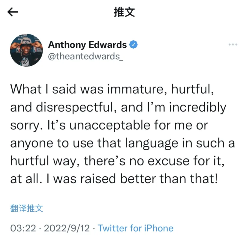 09月12日讯 今日,森林狼后卫安东尼-爱德华兹发推,就他昨日在Instagram Story的动态中出现对于同性恋群体的歧视性言论而发表致歉。