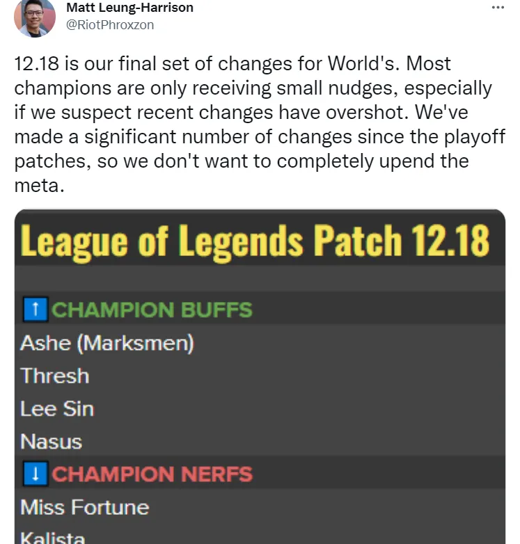 Riot Phroxzon:“12.18版本是世界赛版本的最终改动。大部分英雄都只得到了小小的调整,尤其是如果我们发现最近改动造成了比较大的应该想。我们自季后赛版本以来已经做了很多比较大的变动,所以我们不想完全对版本进行改变。”