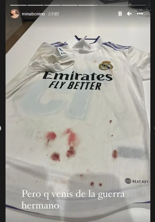 赛后,巴尔韦德的妻子Minabonino在社交媒体上晒出了自己丈夫带血的球衣,并发文道:“你从战场上回来了呀。”,以此来内涵马竞本场比赛犯规凶狠。