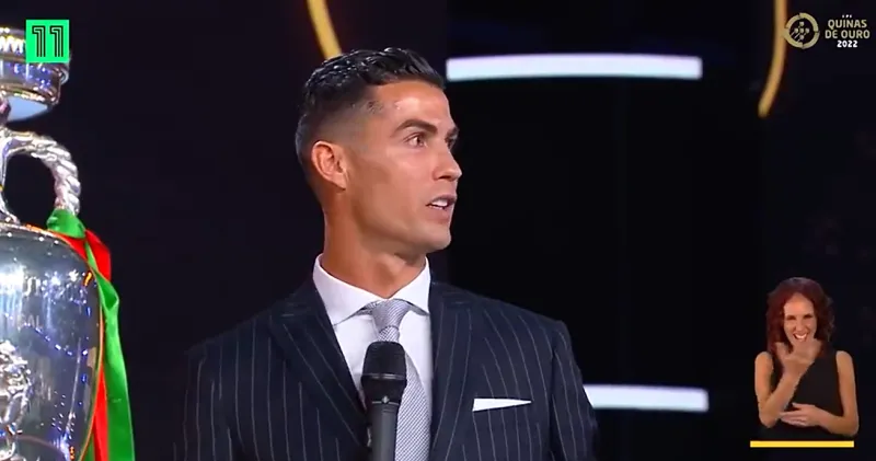 虎扑09月21日讯 今日葡萄牙足协举办了2022年度“Quinas De Ouro”颁奖典礼,葡萄牙国家队射手王C罗出席典礼,领取奖杯并在典礼中发表演讲。