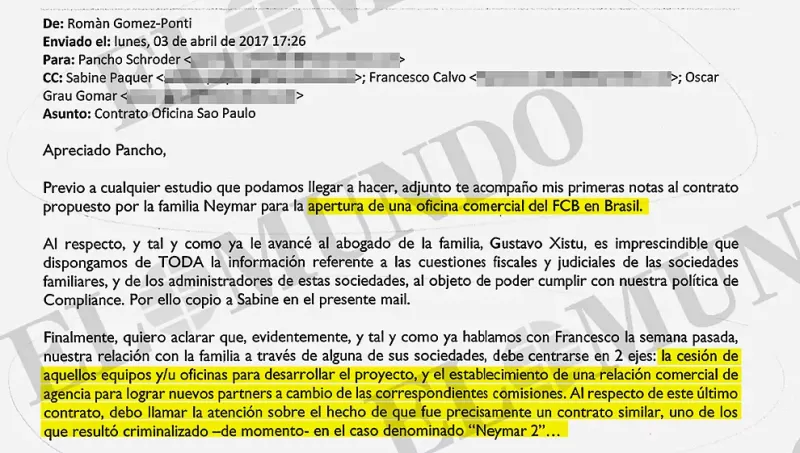 内马尔通过他的父亲和经纪人与巴托梅乌掌舵的巴萨讨论了协议的可能性,但俱乐部的律师和相关负责人提出了强烈反对,他们强调称这样的合同正是可能被定罪的合同。