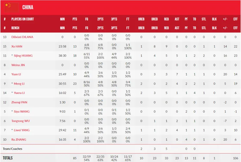 李梦23分2篮板4助攻,黄思静18分5篮板5助攻,韩旭13分9篮板,杨力维11分2篮板4助攻,李缘10分3篮板7助攻。