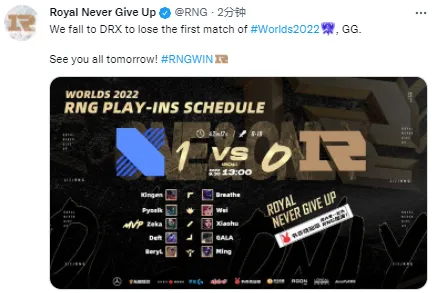 RNG官推:我们输给了DRX,没能拿到首战胜利,GG。明天见吧!