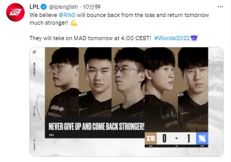 LPL官推:我们坚信RNG能从失利中迅速调整回来,并在明天带来一个更强的表现。他们明天将在10点对阵MAD!