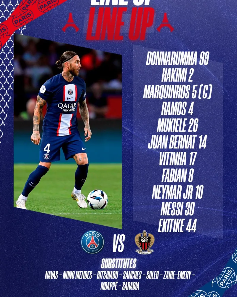 巴黎圣日耳曼首发:99-多纳鲁马、2-阿什拉夫、4-拉莫斯、26-穆基勒、14-贝尔纳特、5-马尔基尼奥斯、8-法比安-鲁伊斯、17-维蒂尼亚、10-内马尔、30-梅西、44-埃基蒂克;