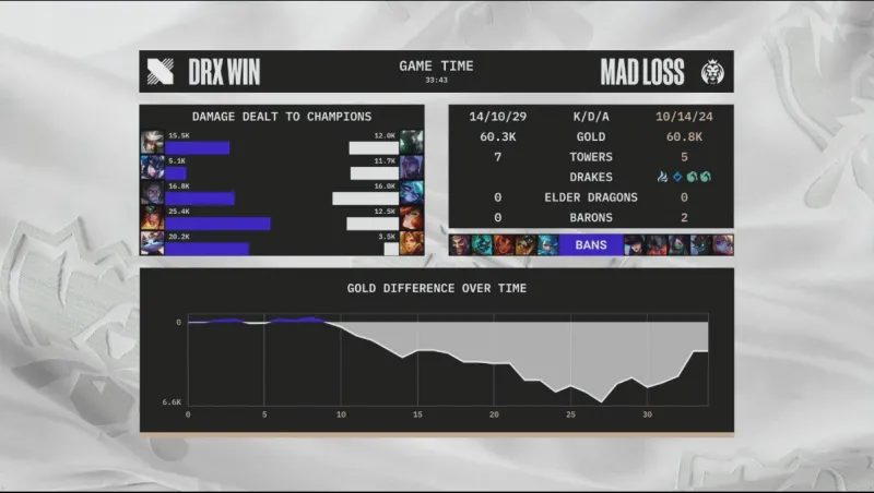32分钟MAD强打大龙造成阵型脱节,DRX逐个击破送给对手团灭,上路一波拿下比赛胜利。