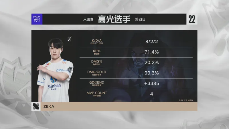 14分钟DRX中路发起攻势,但MAD冷静反打由Elyoya虚空女皇再拿一颗人头;