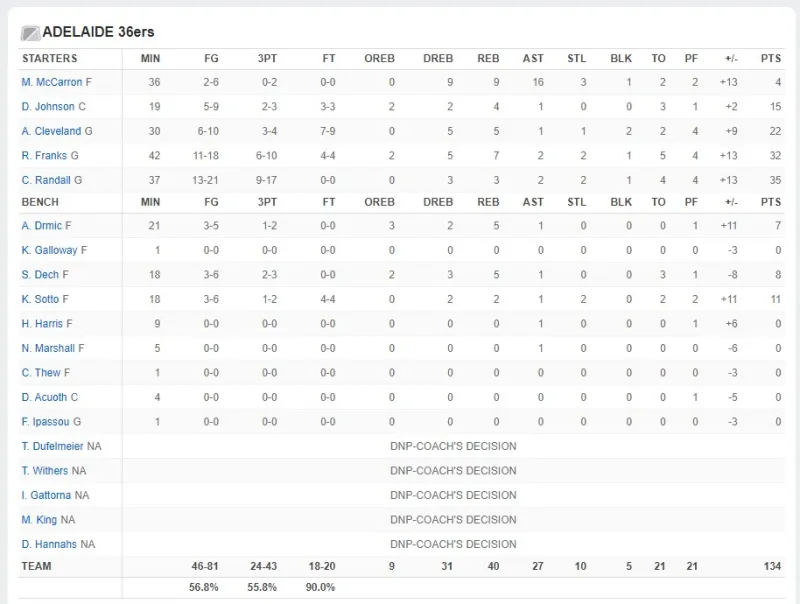 阿德莱德36人来自NBL(澳洲篮球联盟),21-22赛季,36人取得10胜18负的战绩,胜率35.7%,常规赛排名倒数第3。