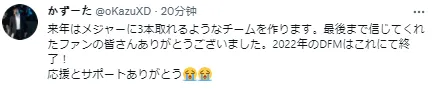 明年要打造一支能赢四大赛区三局的队伍!非常感谢一直相信我们的粉丝们。2022年的DFM就走到这里啦!感谢加油和支持(哭)