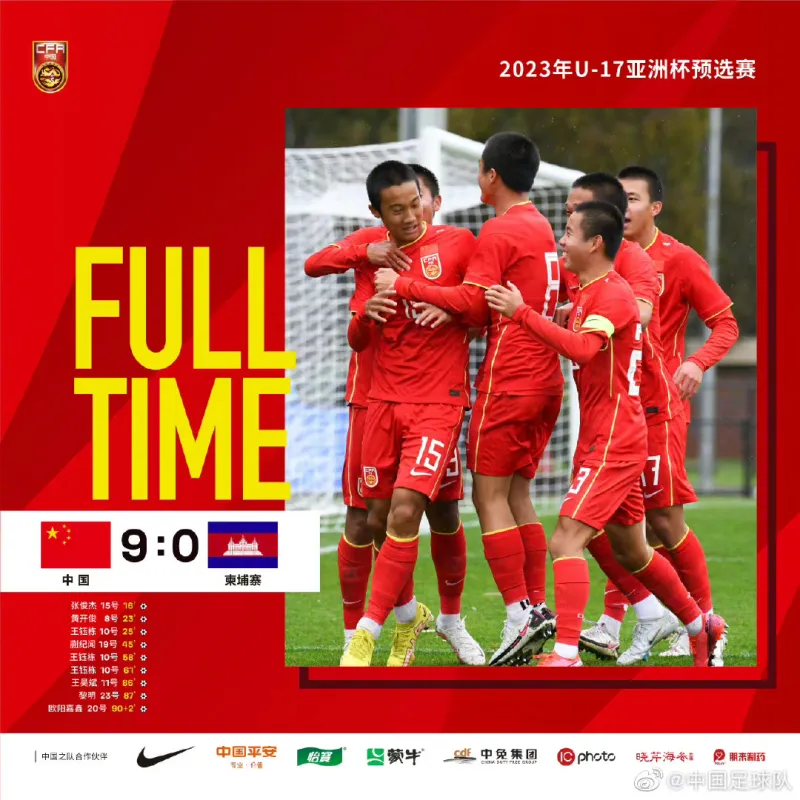 法兰克福名宿杨晨挂帅的国少多点开花。凭借王钰栋的帽子戏法以及张俊杰、黄开俊、蒯纪闻、王昊斌、黎明、欧阳嘉鑫的进球,中国国少9-0大胜柬埔寨取得开门红。