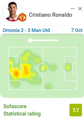 本场比赛中,C罗sofascore评分为7.7分全场第二,仅次于2射1传的拉什福德。具体数据如下: