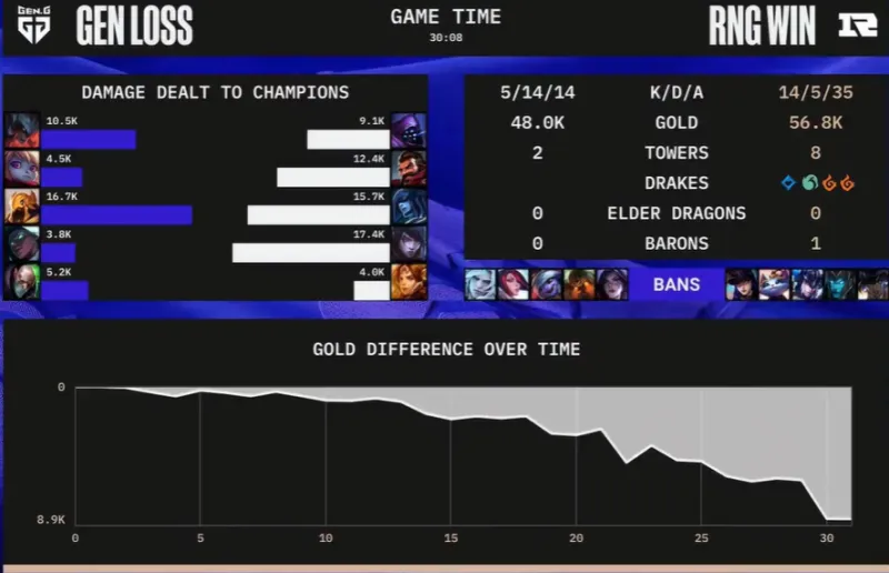 29分钟,双方大龙处交战,RNG完成一波1换4完美团战,一波终结比赛。