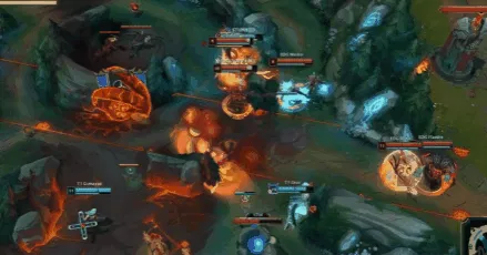 11分钟,小龙团战一触即发,蔚先手开团无果,T1完成一波1换2团战,顺势拿下小龙。