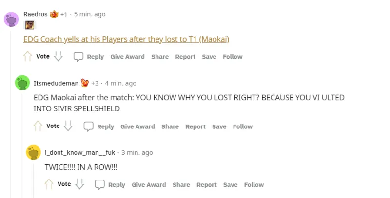 EDG教练在输给T1之后狂喷选手(茂凯)