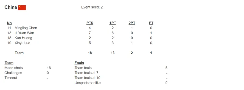 中国女队数据:陈明伶4分、万济圆7分、罗欣棫5分、黄琨2分。