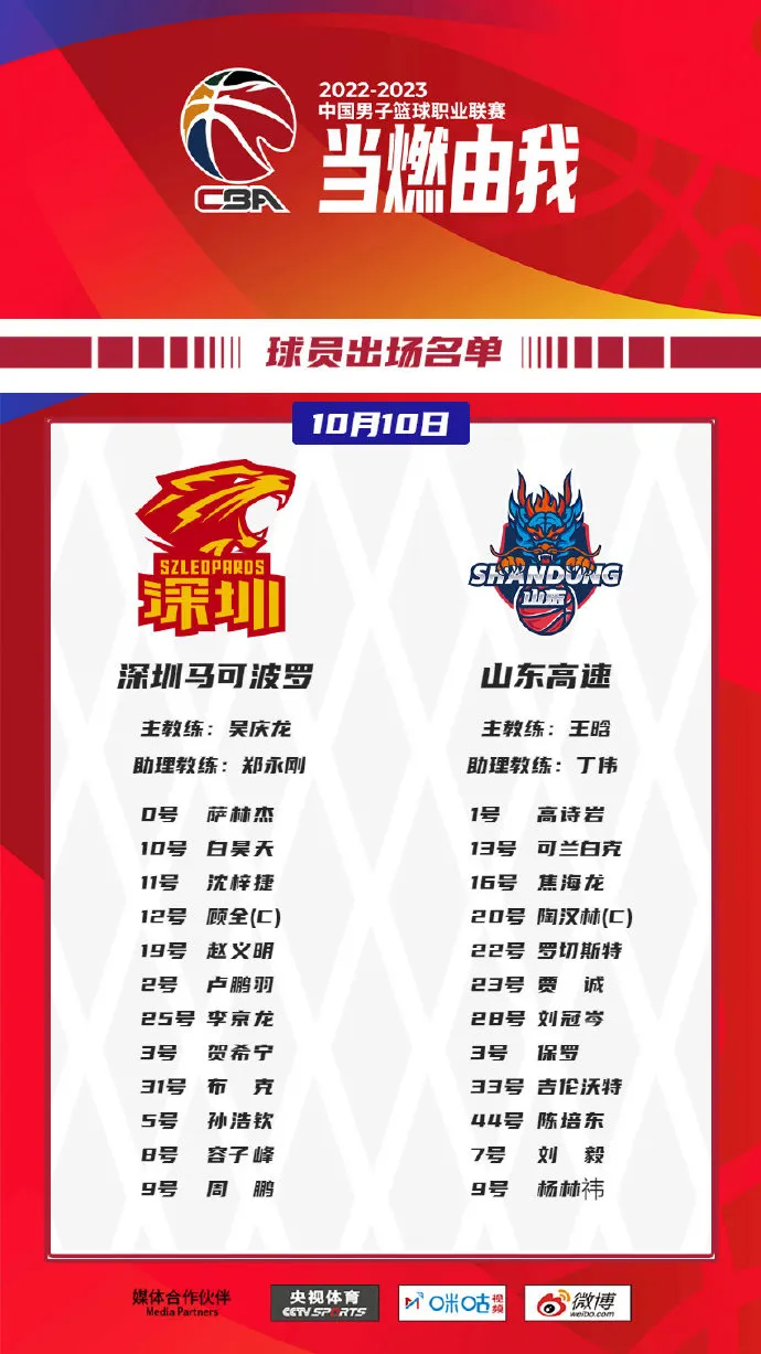 虎扑10月10日讯 2022-23赛季CBA联赛常规赛揭幕战,深圳队对阵山东队大名单出炉,其中山东队三外援均在列,深圳队球员周鹏在列。