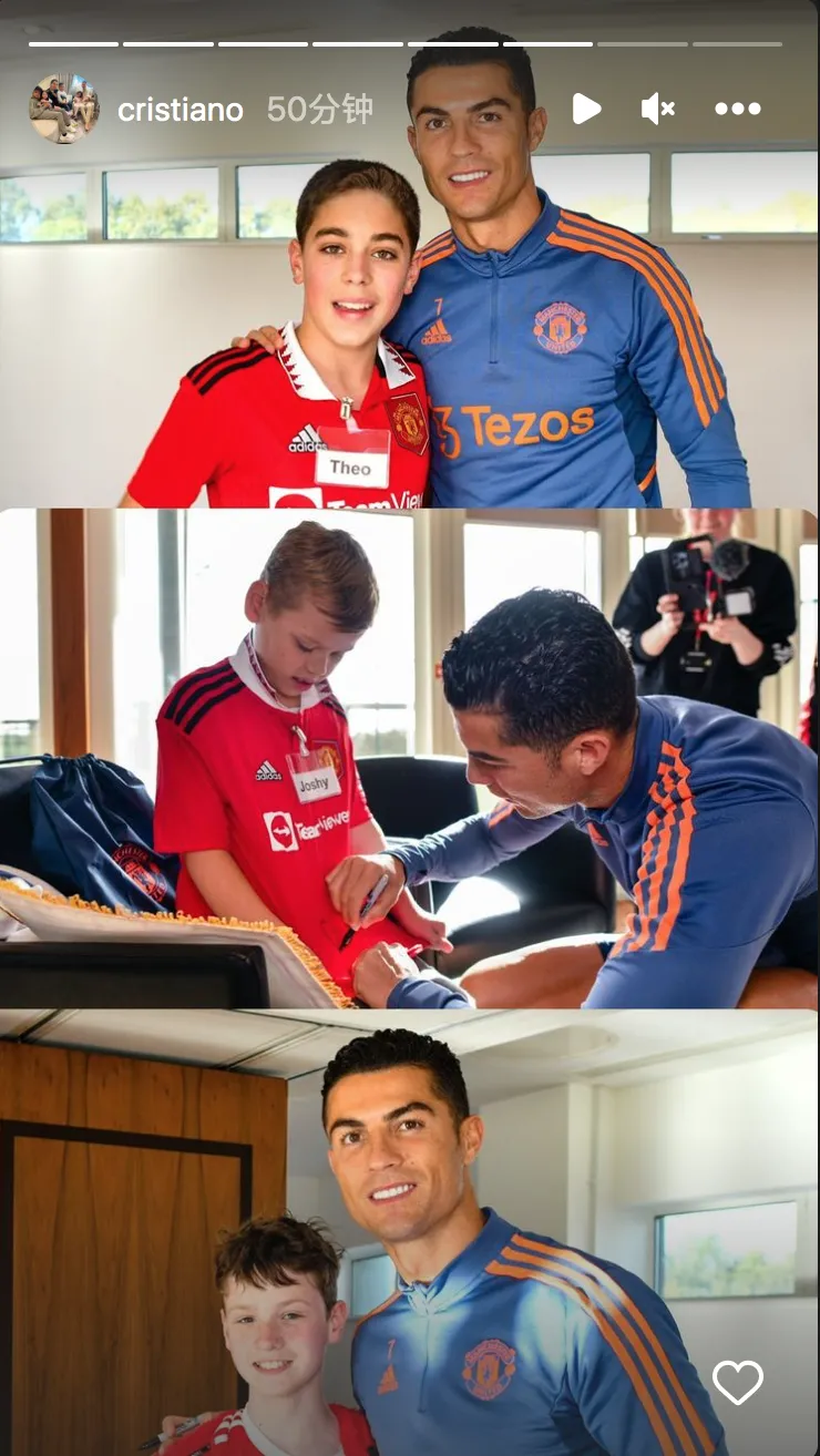 C罗在个人社交平台也晒出了自己与小球迷亲切互动的照片,照片中C罗不仅与小球迷握手拥抱,向他们赠予队旗,并且还逐一签名合影。场面十分暖心。