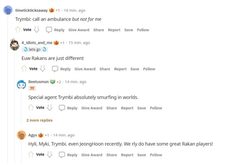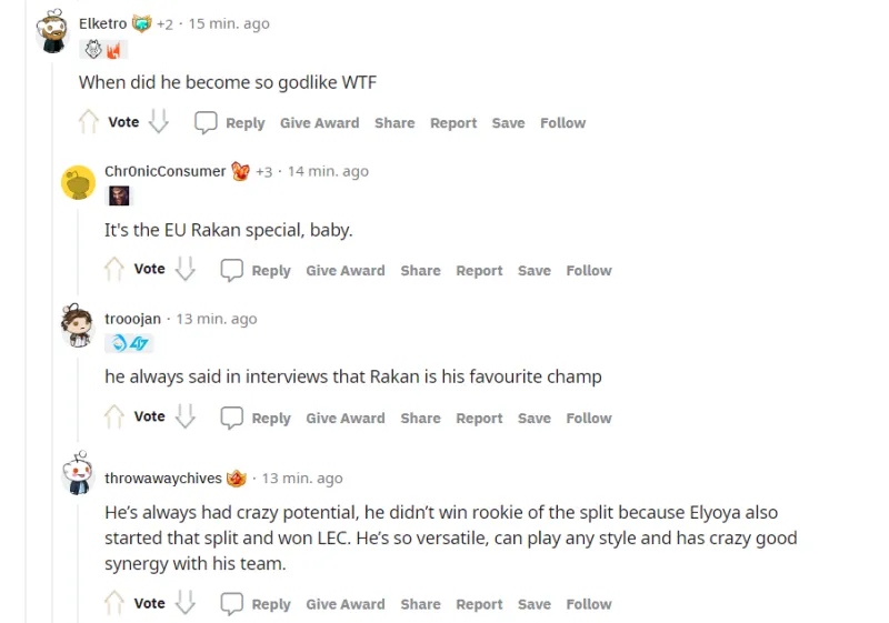 他的潜力总是很高,他没能拿到最佳新人因为Elyoya也是那年的新人,而且还拿到了LEC冠军。而且Trymbi的多样性很好,他能玩任何风格的辅助,而且和整个队伍的协作很好。