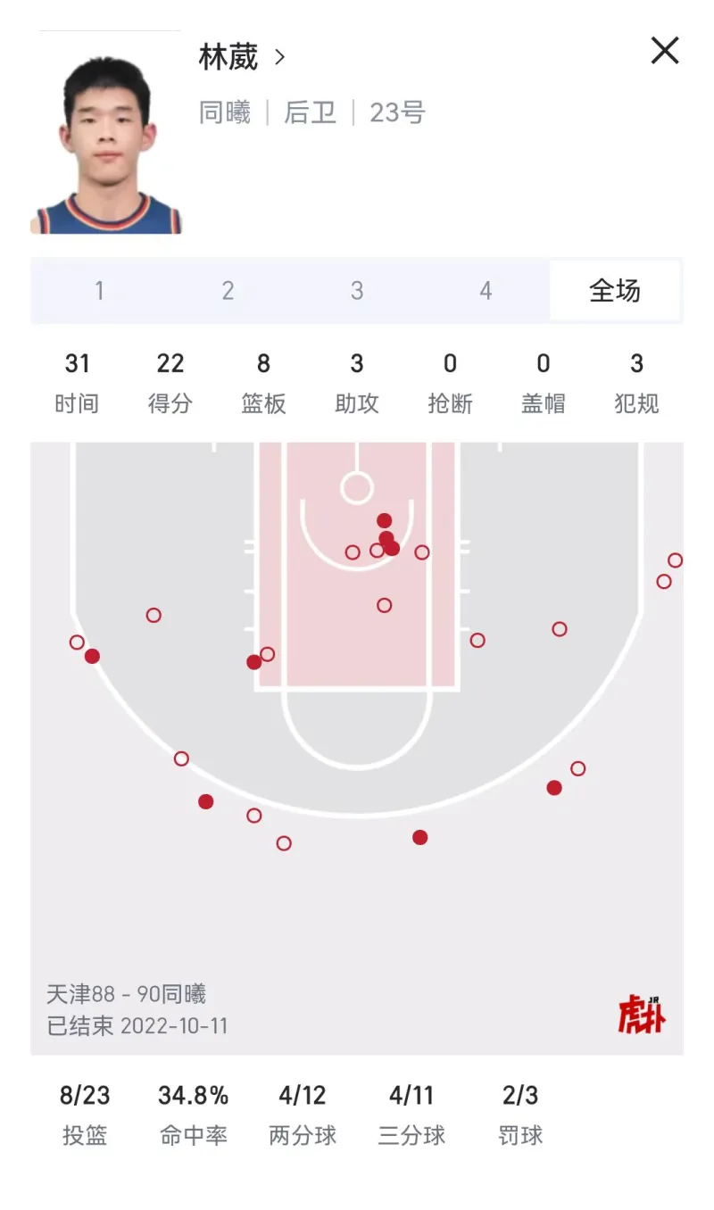 虎扑10月11日讯 2022-23赛季CBA常规赛,同曦男篮90-88击败天津男篮拿下赛季首胜,南京同曦队18岁的小将林葳发挥出色拿到22分8篮板3助攻,并在比赛最后时刻命中了关键的绝杀球。
