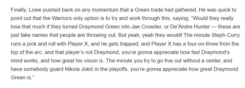 “想象一下,斯蒂芬-库里与队友X发起挡拆配合,库里遭遇了包夹,球员X在弧顶有局部四打三的机会,当那个处理球的人不是追梦时,你才会回想起追梦的运转球速度有多快,以及他的视野有多出色。还有,当你要祭出一个没有中锋的五小阵容,同时需要其中能有人防守尼古拉-约基奇时,你才会回忆起德雷蒙德-格林的伟大。”