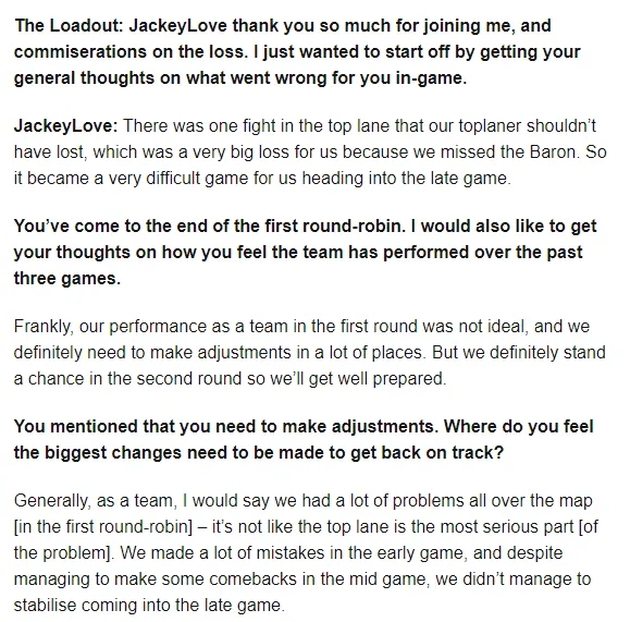 JackeyLove:通常来讲,作为一个团队,我会说我们在整个地图都出了不少问题(在小组赛首轮)——这倒并不是说上路的问题就是最严重的。我们在比赛前期犯了很多错误。虽然在中期打回来了一些,但我们并没能稳住局势拖到后期。