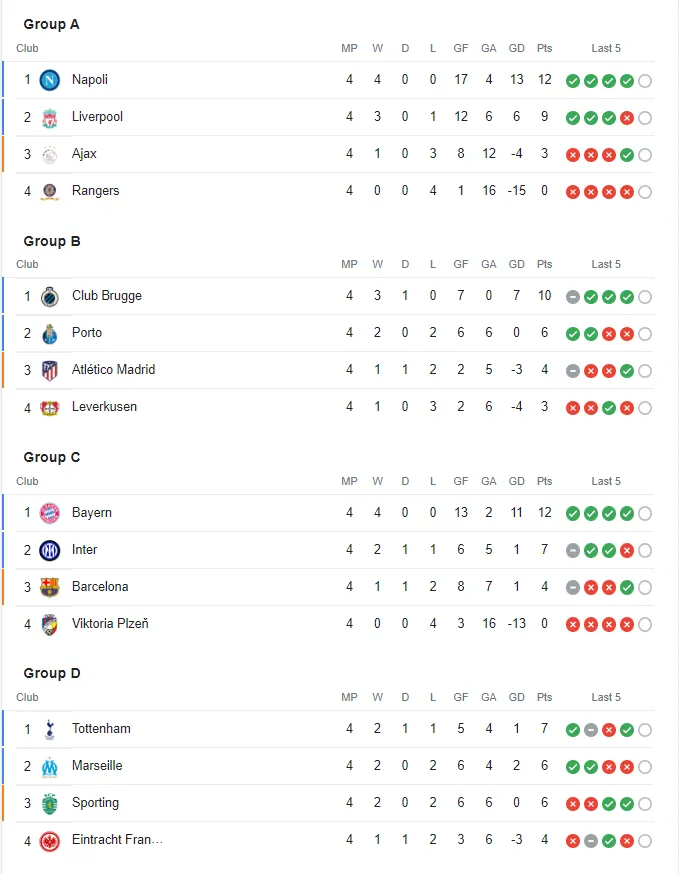 B组中,布鲁日成最大黑马,4战取得3胜1平提前出线,波尔图积6分排名第二,马德里竞技和勒沃库森分别积4分和3分,勒沃库森排名垫底。