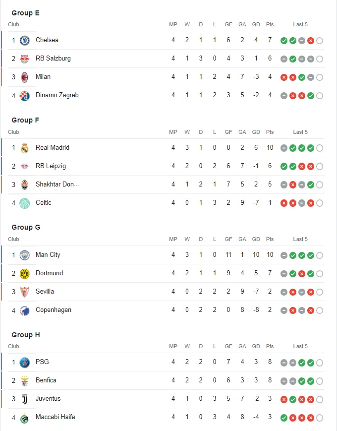 E组中,切尔西积7分排名第一,萨尔茨堡红牛积6分排名第二,AC米兰与萨格勒布迪纳摩同积4分,目前四支球队均有机会出线。
