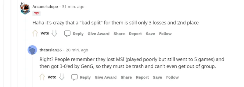 对吧?人们只记住了他们输掉MSI(确实打得很差,但是也打到了第五局),被GEN 3-0,所以他们一定是垃圾,根本没法小组出线是吧。