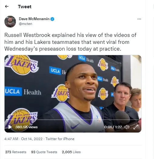 随后湖人随队记者Dave McMenamin晒出了一段威少赛后接受采访的视频,该视频中威少对该事件解释道:zSt拜客生活常识网