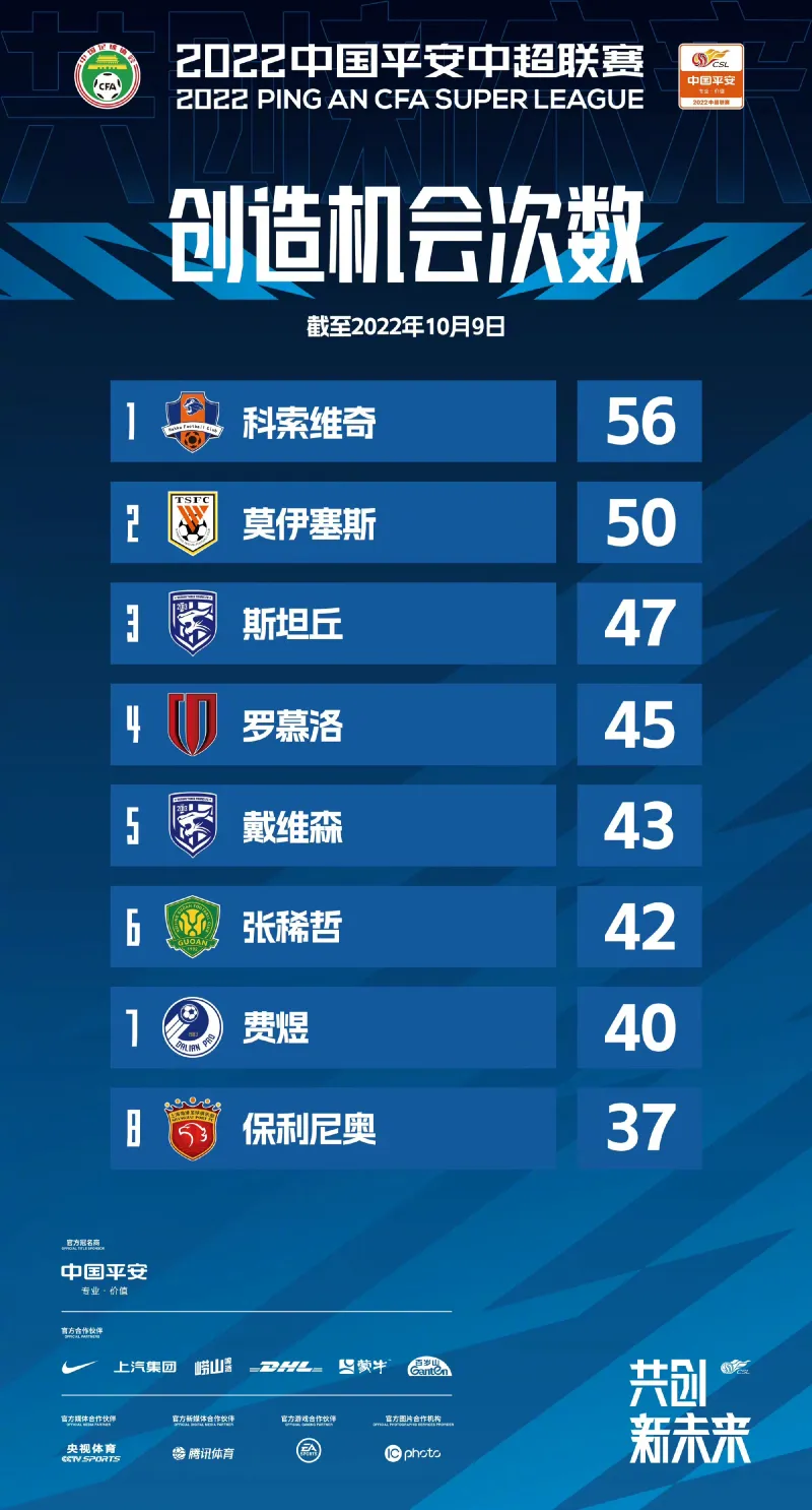 虎扑10月20日讯 中超联赛官方公布了2022中超联赛创造机会次数排行,科索维奇、莫伊塞斯领衔。