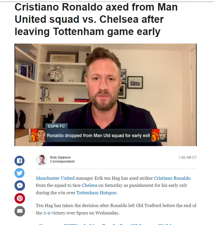 ESPN方面的原文透露的消息没有太大区别,包括C罗将被排除出一线队训练三天、管理层支持滕哈格的做法,但坚称这位37岁的老将仍然是“球队的重要一员”。