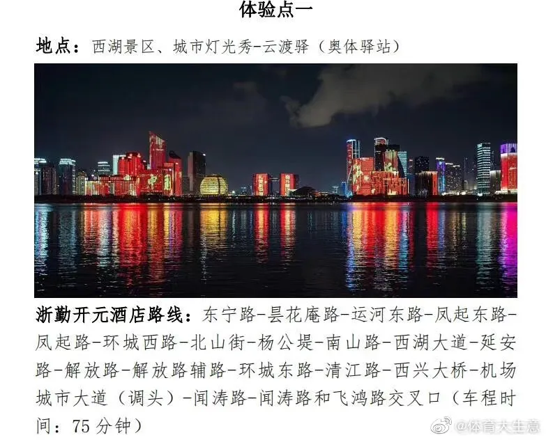 并且每个景点都有多个不同线路可供选择,且每个线路都途径不少名胜古迹,看得出来,线路设计得非常走心。另外,CBA还精心整理了杭州城市灯光秀的详细信息,供有兴趣的CBA球员欣赏。”