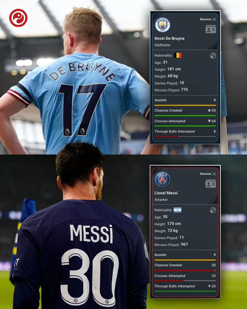 Squakwa还列出了两人其他传球方面的数据,其中传中德布劳内占优,直传球梅西占优,而创造机会次数两人非常接近。
