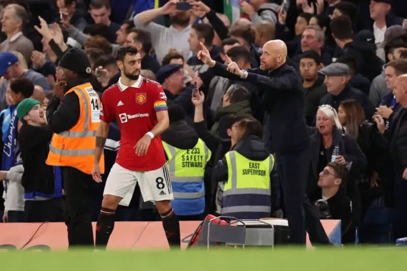 在若日尼奥在12码处破门帮助切尔西1-0领先后,滕哈格把布鲁诺-费尔南德斯叫到边线旁。曼联主帅把一只手放在球员的肩膀上,另一只手从右向左做手势,从防守到进攻。
