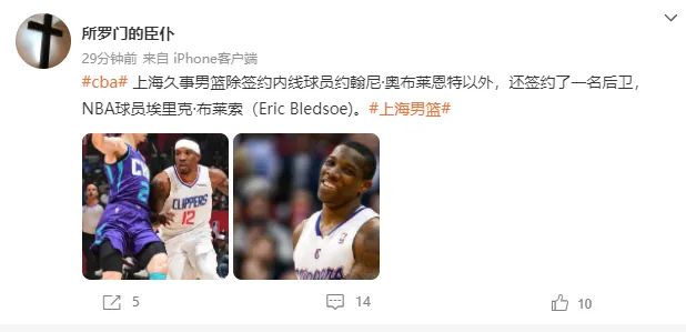 虎扑10月24日讯 据媒体人“所罗门的臣仆”在社交媒体上透露,上海队除了签下内线约翰尼-奥布莱恩特之外,还签下了前NBA球员埃里克-布莱索。