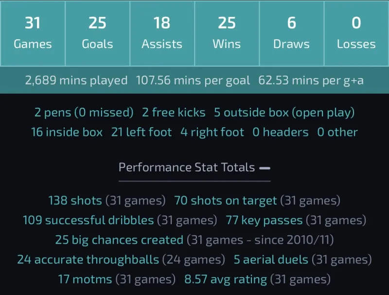 数据统计,梅西所参加的近31场比赛全部保持不败,追平了他个人最好纪录。阿根廷人在这31场比赛里一共取得了25胜6平的成绩,打入25球,并贡献18次助攻。