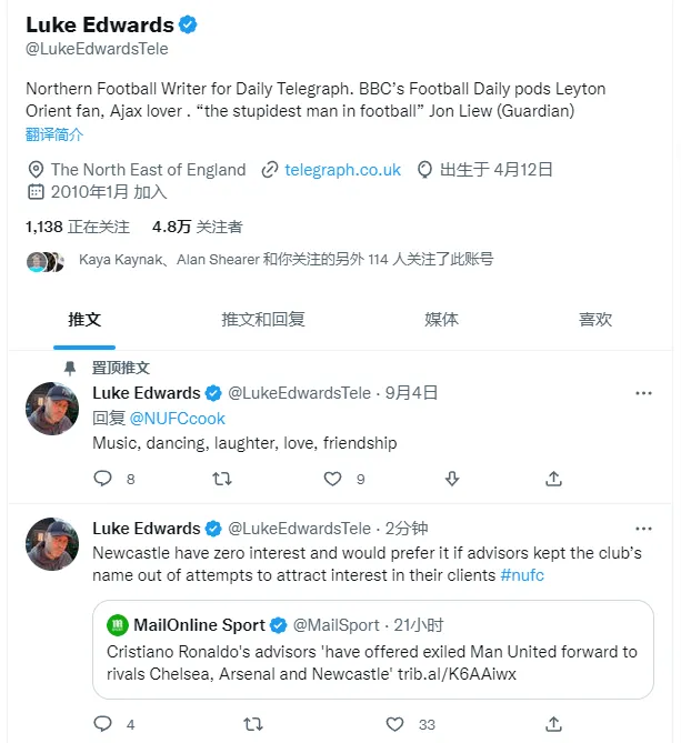 虎扑10月26日讯 每日电讯报纽卡斯尔方面著名记者Luke Edwards(纽卡方面绝对的T1)在推特上转发了每日邮报的官推报道,其中是关于C罗的。