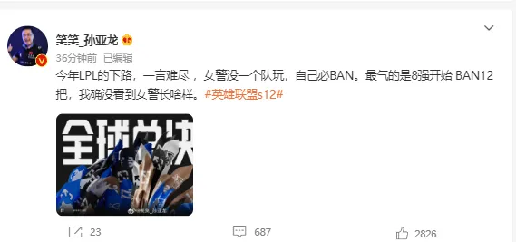 笑笑:今年LPL的下路,一言难尽 ,女警没一个队玩,自己必BAN。最气的是8强开始 BAN12把,我确没看到女警长啥样。