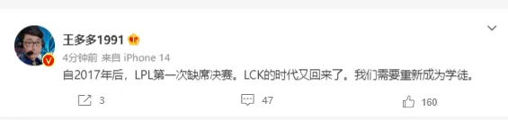 王多多:自2017年后,LPL第一次缺席决赛。LCK的时代又回来了。我们需要重新成为学徒。