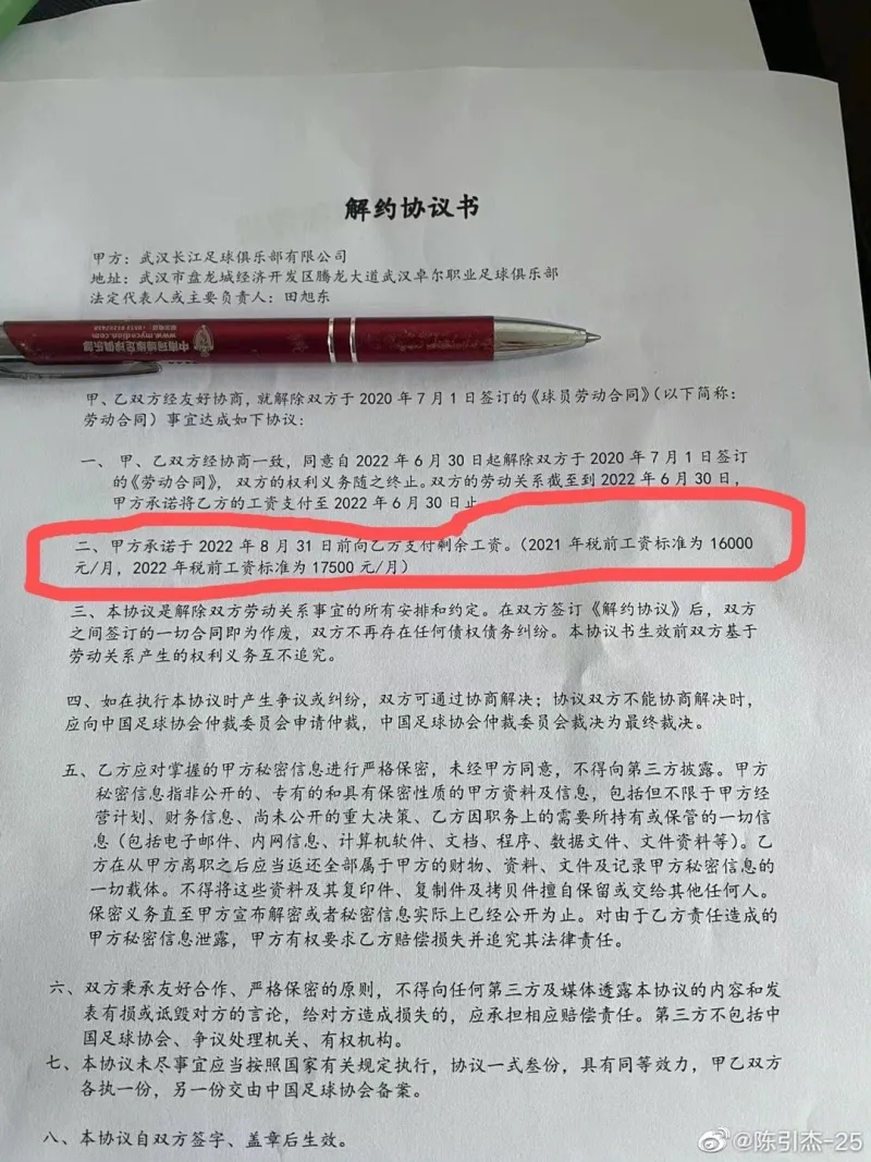 虎扑11月10日讯 今天,前武汉长江球员陈引杰在个人微博发文讨薪,控诉俱乐部出尔反尔。