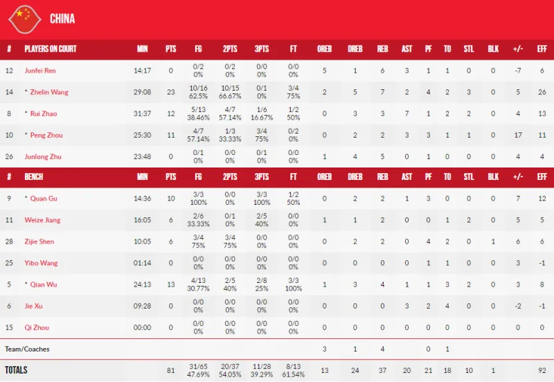 中国队数据:王哲林23分7板;赵睿12分7助攻;吴前13分4板 。