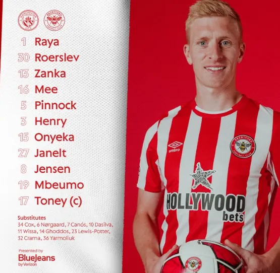 布伦特福德首发:1-大卫-拉亚、5-平诺克、16-本-米、13-赞卡、3-里科-亨利、8-延森、15-奥涅卡、27-雅内特、30-罗斯勒夫-拉斯姆森、17-伊万-托尼、19-姆贝莫