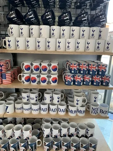 除了球衣,孙兴慜的形象还体现在商店里印有韩国国旗的马克杯、帽子、胸针和印有他头像的围巾。