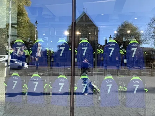 在热刺的球迷周边商店里,立有孙兴慜的巨幅广告牌,橱窗最显眼位置挂着的就是他的7号热刺战袍。