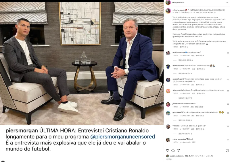 虎扑11月14日讯 被C罗评论Factors的人迷cr7.o_lendario在皮尔斯-摩根放出C罗专访预告之后刊发了Ins的文章。