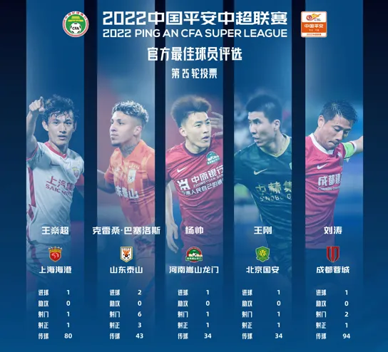 虎扑11月14日讯 中超联赛官方今天公布了中超第25轮最佳球员候选名单,入围本轮评选的五位球员是: