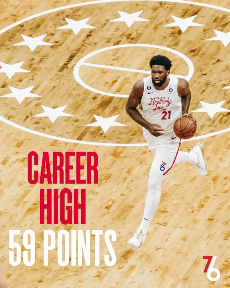 本场比赛,恩比德出场37分钟,得到59分11篮板8助攻1抢断7盖帽,投篮28中19。