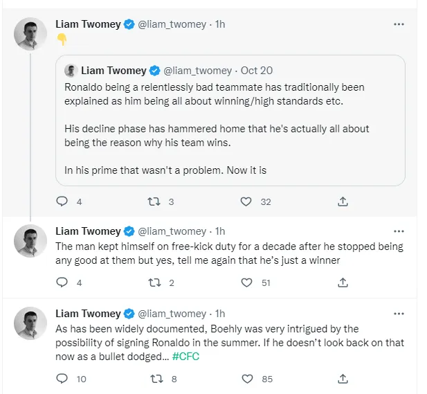 此外,Liam Twomey再次转发了自己在今年8月20日对于C罗的评价:“C罗是一个无情的糟糕队友,传统上是被解释为他只追求胜利高标准等等