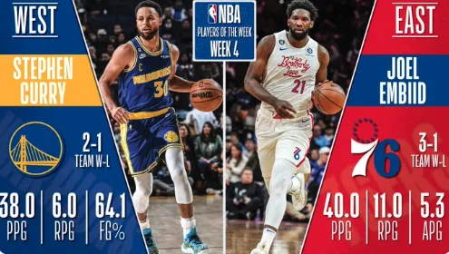 虎扑11月15日讯 今日联盟官方公布上周东西部周最佳球员,勇士后卫斯蒂芬-库里和76人中锋乔尔-恩比德分别当选。