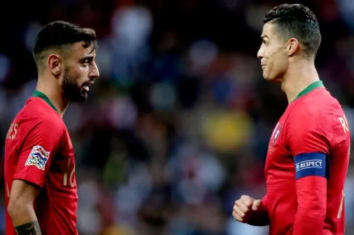 C罗在国家队看到了布鲁诺-费尔南德斯,然后打趣道:“你是坐船来的吗?”